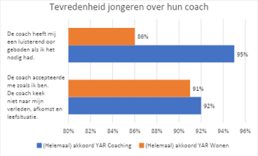 In YAR Coaching voelt 92% van de jongeren zich geaccepteerd door hun coach. 95% kreeg een luisterend oor wanneer nodig. Bij YAR Wonen liggen deze percentages op 91% en 86%.