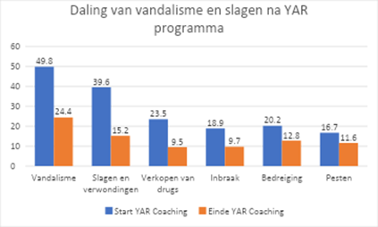 Bij jongeren in YAR Coaching daalde de betrokkenheid bij vandalisme van 50% naar 24%. Bij slagen en verwondingen ging het om een daling van 40% naar 15%.