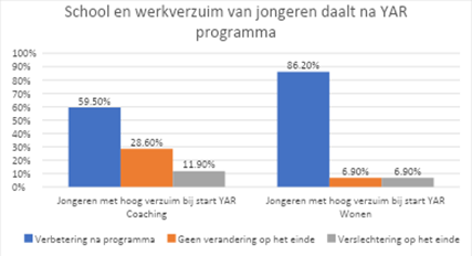 De resultaten zijn opvallend. Bij jongeren die startten met een hoog verzuim, rapporteerden 6 op 10 jongeren (59,5%) in YAR Coaching een verbetering tegen het einde van het programma. In YAR Wonen lag dit cijfer op 86%.
