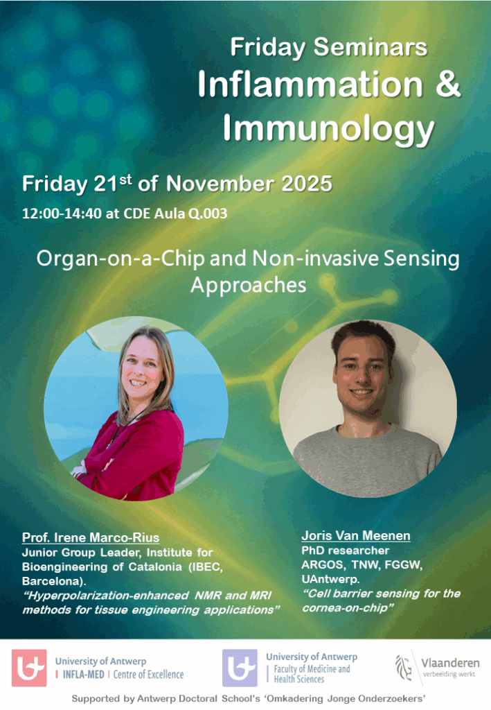 Op vrijdag 21 november gaat Joris dieper in op dit thema tijdens Friday Seminars ‘Inflammation & Immunology’ op Campus Drie Eiken. Daarnaast zal professor Irene Marco Rius van het Institute for Bioengineering of Catalonia (Barcelona) een lezing geven over haar innovatieve MRI-techniek die ze toepast op kleinschalige modellen zoals OOC’s.