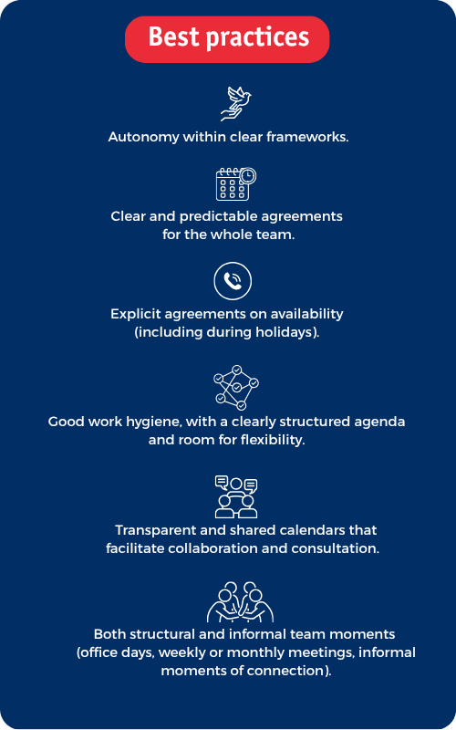 Work-life balance is also about self-care and about how work is organised: flexible hours, autonomy, team agreements on availability and room to adjust (sometimes temporarily). ‘It’s important to make explicit agreements about boundaries and availability.