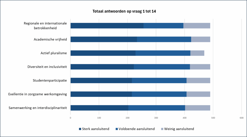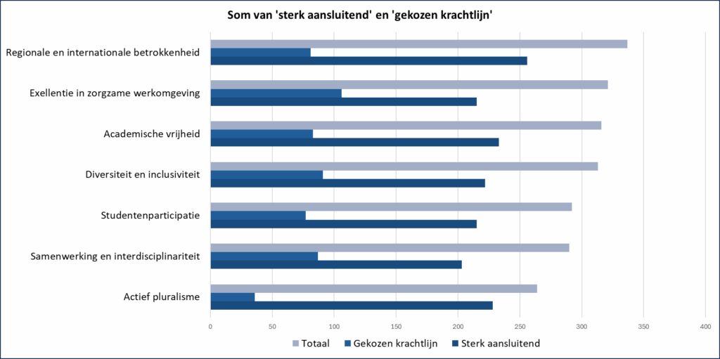 Wanneer we kijken naar de krachtlijn die het sterkst in het werk van onze medewerkers leeft, valt er één meteen op, namelijk Regionale en internationale betrokkenheid. Op nummer twee en drie vinden we Academische vrijheid en Actief pluralisme. Deze troeven blijken dus sterk herkenbaar in het dagelijkse handelen van deze collega’s, ook als ze daar misschien niet altijd bewust bij stilstaan.