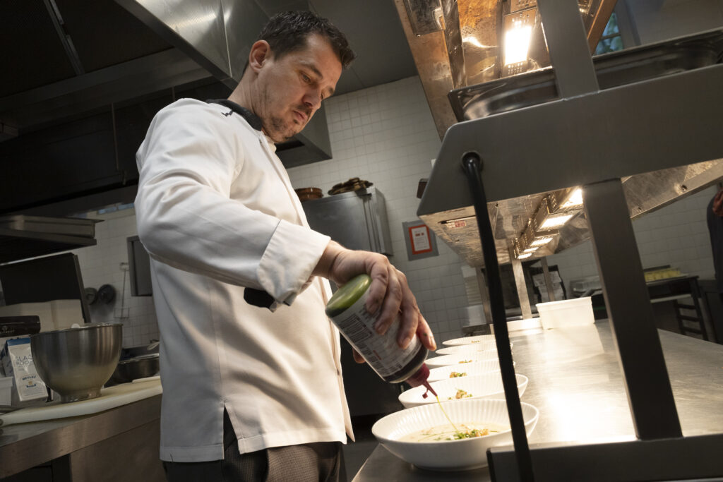 Chef-kok Aaron De Ceuster is er al bij sinds de start van de Universiteitsclub in 2007. De basis van zijn keuken is Frans, maar wordt regelmatig verrijkt met mediterrane en Aziatische invloeden. “Ik krijg hier veel vrijheid om te experimenteren met smaken en combinaties,” zegt hij. “Het publiek waardeert kwaliteit en staat open voor vernieuwing. Dat motiveert.”