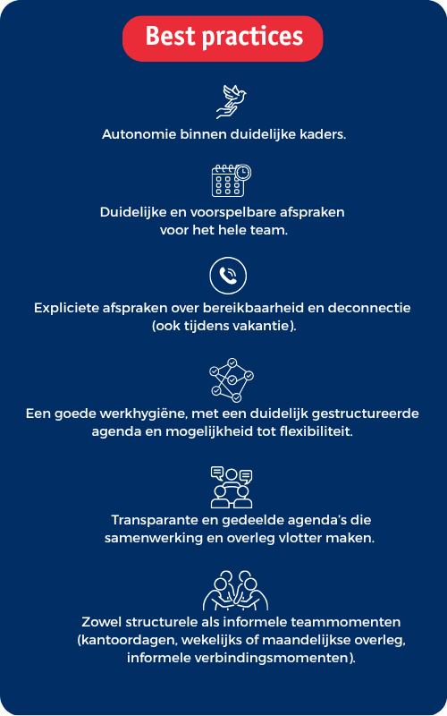 Goede functionerende teams maken duidelijke afspraken over wanneer ze bereikbaar zijn, wanneer ze elkaar zien en hoe ze afwezigheden opvangen. Dat voorkomt een gevoel van willekeur.